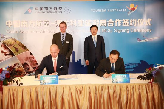 The three-year Memorandum of Understanding (MoU) was signed today in Adelaide by China Southern Airlines Director General, Commercial Steering Committee Guo Jianye and Tourism Australia Managing Director John O'Sullivan. The signing was witnessed by China Southern Airlines President and CEO Tan Wan Geng and Tourism Australia Chairman Tony South.